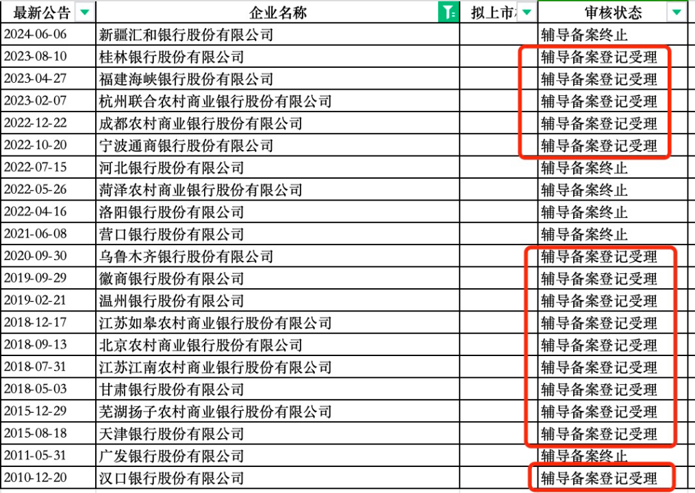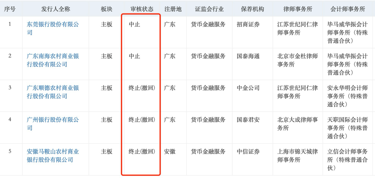 今年6月,广东顺德农商行与保荐机构主动撤回发行申请,深交所随即终止其审核;1月,排队近五年的广州银行也作出了“撤回发行上市申请”的决定;2024年以来,亳州药都农商行、江苏海安农商行、安徽马鞍山农商行等相继退出IPO进程,银行上市“后备军”规模持续收缩。