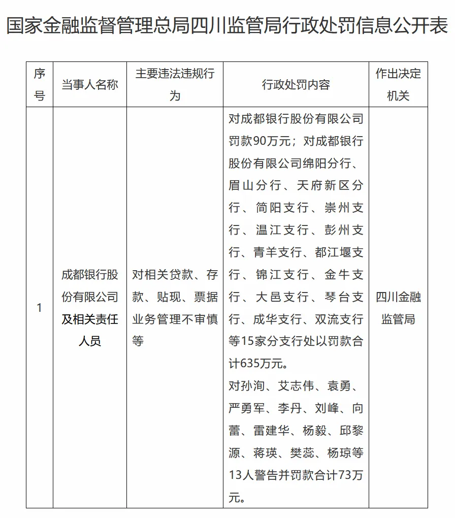 近日,国家金融监督管理总局四川监管局披露的行政处罚信息显示,因对相关贷款、存款、贴现、票据业务管理不审慎等,成都银行股份有限公司被罚款90万元,成都银行绵阳分行、眉山分行、天府新区分行、简阳支行、崇州支行、温江支行、彭州支行、青羊支行、都江堰支行、锦江支行、金牛支行、大邑支行、琴台支行、成华支行、双流支行等15家分支行被处以罚款合计635万元,相关责任人孙洵、艾志伟、袁勇、严勇军、李丹、刘峰、向蕾、雷建华、杨毅、邱黎源、蒋瑛、樊蕊、杨琼等13人警告并罚款合计73万元。