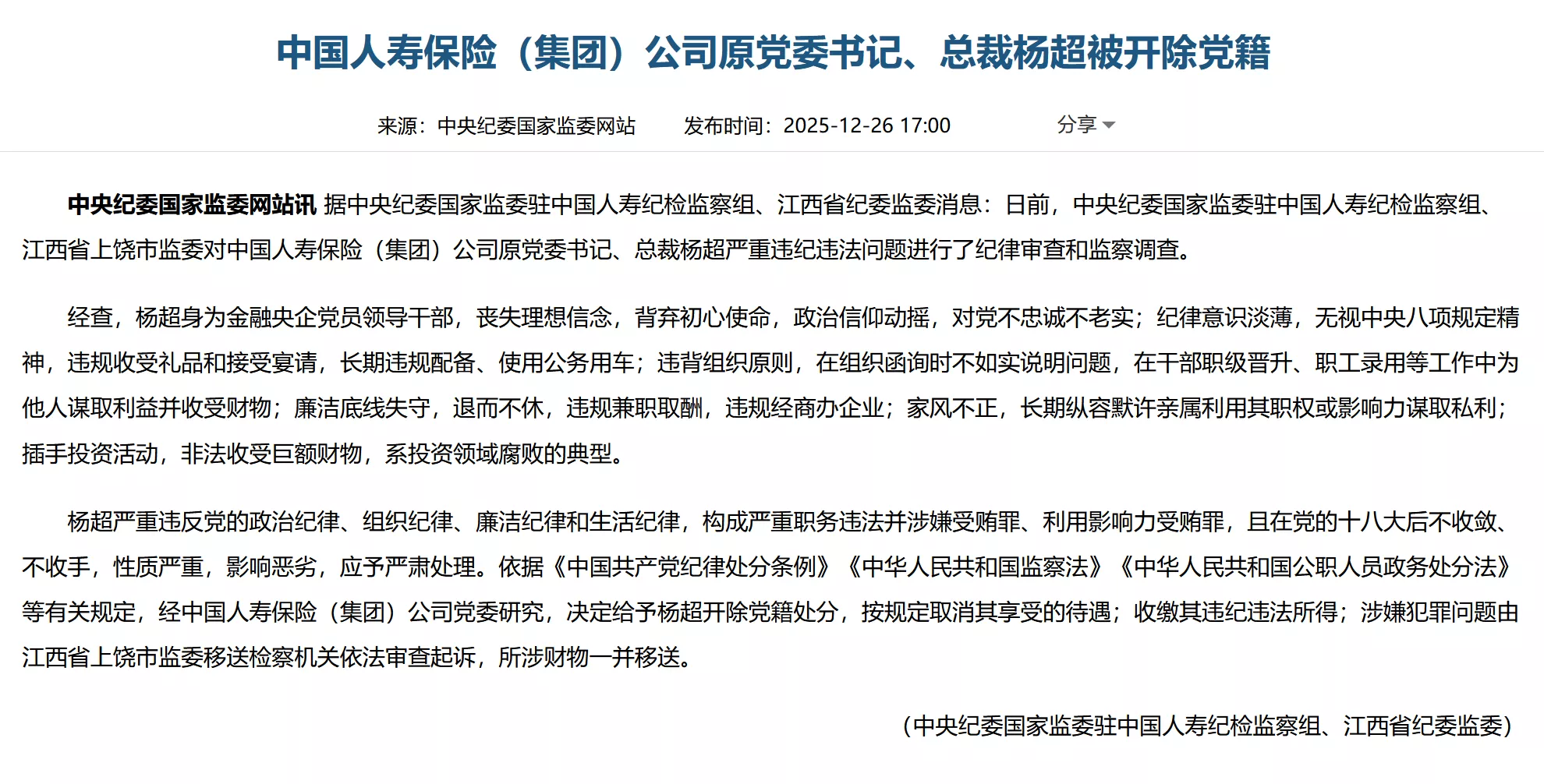 杨超严重违反党的政治纪律、组织纪律、廉洁纪律和生活纪律,构成严重职务违法并涉嫌受贿罪、利用影响力受贿罪,且在党的十八大后不收敛、不收手,性质严重,影响恶劣,应予严肃处理。依据《中国共产党纪律处分条例》《中华人民共和国监察法》《中华人民共和国公职人员政务处分法》等有关规定,经中国人寿保险(集团)公司党委研究,决定给予杨超开除党籍处分,按规定取消其享受的待遇;收缴其违纪违法所得;涉嫌犯罪问题由江西省上饶市监委移送检察机关依法审查起诉,所涉财物一并移送。