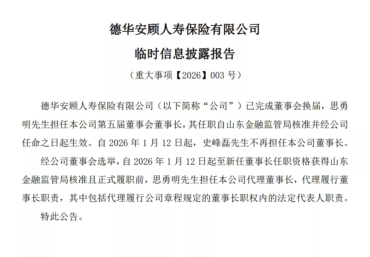 近日,德华安顾人寿发布公告称,该公司已完成董事会换届,思勇明担任公司第五届董事会董事长,其任职自山东金融监管局核准并经公司任命之日起生效。自2026年1月12日起,史峰磊不再担任公司董事长。
