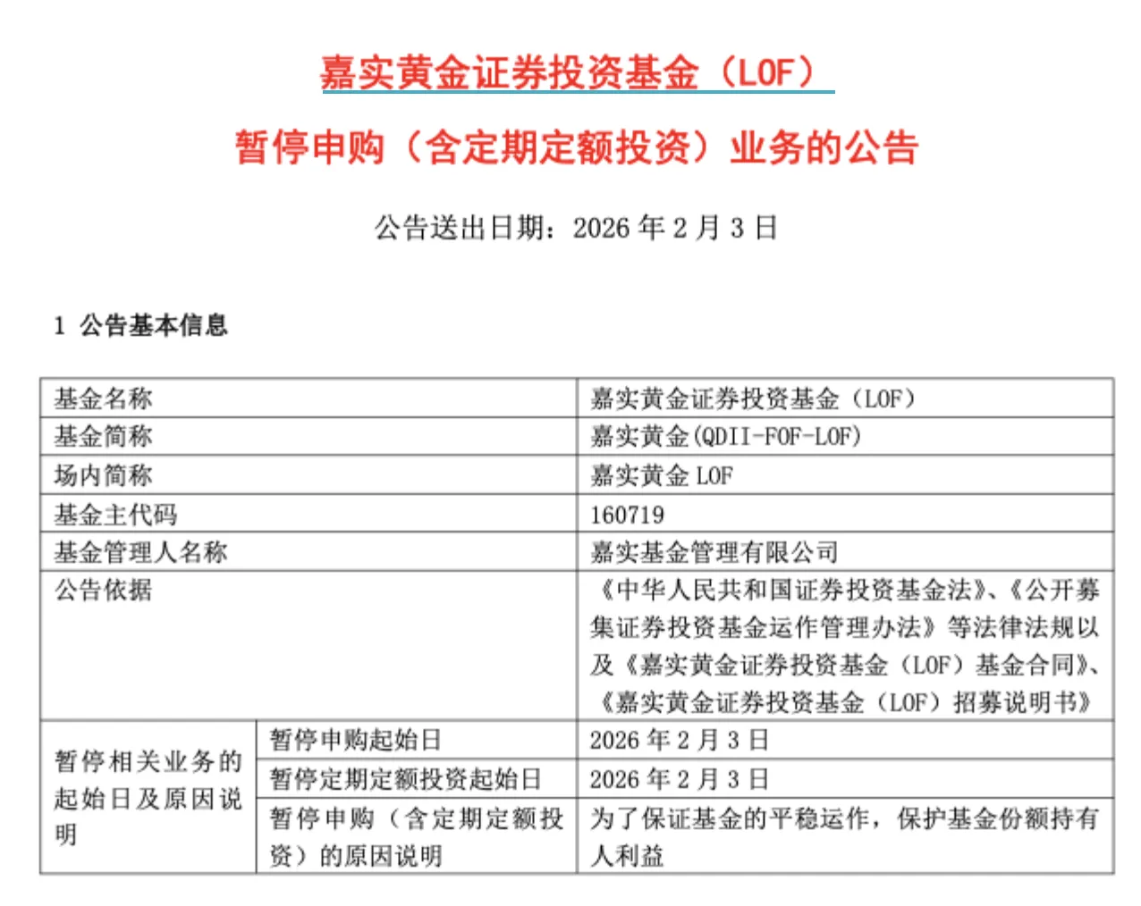 嘉实基金管理有限公司发布公告,嘉实黄金证券投资基金(LOF)自2026年2月3日起暂停申购及定期定额投资业务,原因是基金管理人嘉实基金管理有限公司为保障基金平稳运作及保护基金份额持有人利益。