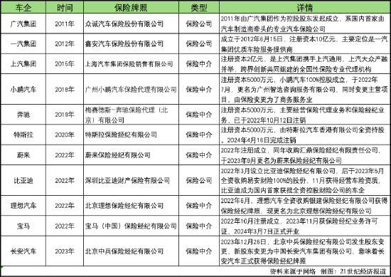 这并非车企第一次入局保险业。早在传统燃油车当道的2011年,广汽集团、一汽集团就已成立自己的汽车保险公司。小鹏、蔚来、比亚迪、理想等新能源车企在2018年至2023年间通过设立和收购保险经纪公司,搭建自己的车险业务。随着新能源车的渗透率不断提高,越来越多的车企加入车险这一产业链。