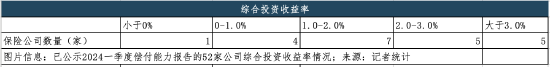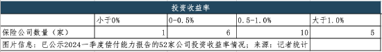 行业亦面临相似压力。记者统计发现,一季度,22家人身险公司投资收益率普遍低于1.0%,其中,1家公司投资收益为负、6家公司在0-0.5%之间、10家公司在0.5-1.0%之间、5家公司高于1.0%;22家公司综合投资收益率普遍低于3%,其中,1家公司综合投资收益率为负、4家公司在0-1.0%之间、7家公司在1.0-2.0%之间、5家公司在2.0-3.0%之间、5家公司高于3.0%。