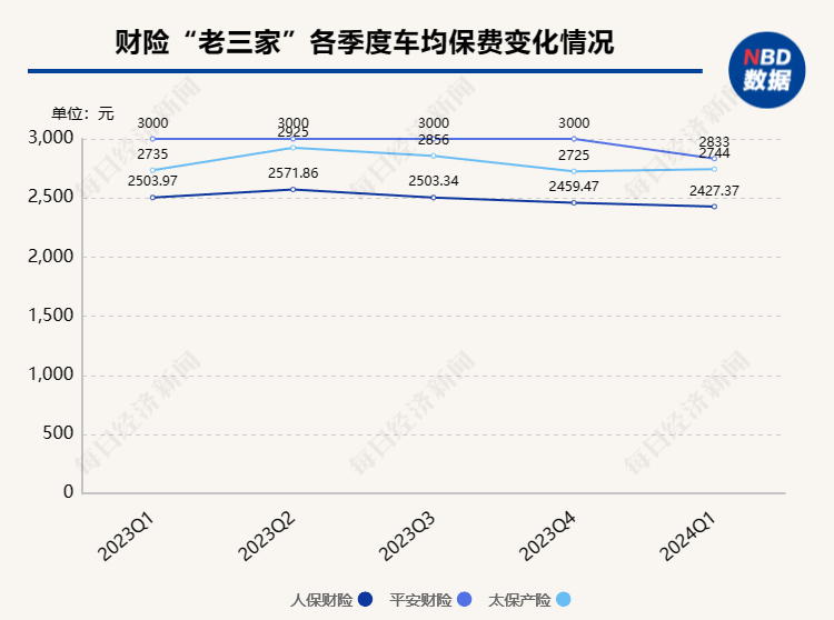 以“老三家”为例,今年一季度人保财险、平安财险、太保产险的车均保费分别为2427.37元、2833元、2744元,对比去年的数据,无论是同比还是环比,其上涨和下调的幅度都不大。