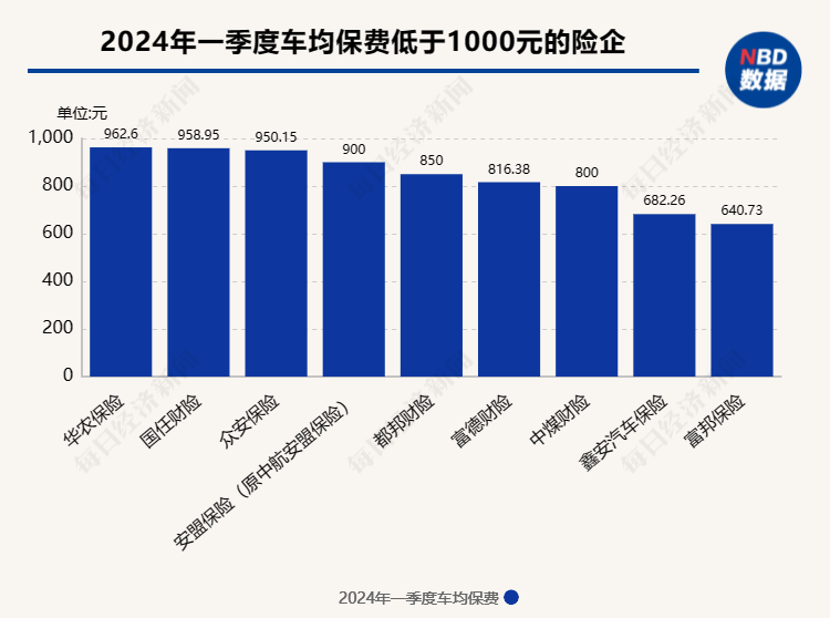 具体来看,一季度车均保费不到1000元的共有9家,分别是华农保险、国任财险、众安保险、安盟保险(原中航安盟保险)都邦财险、富德财险、中煤财险、鑫安汽车保险、富邦保险,车均保费分别为962.6元、958.95元、950.15元、900元、850元、816.38元、800元、682.26元、640.73元。