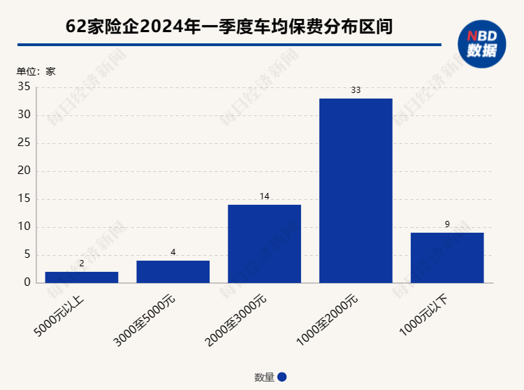 《每日经济新闻》记者统计发现,一季度有42家机构的车均保费低于2000元,占比接近七成。其中,车均保费低于1000元的险企有9家,车均保费在1000至2000元区间的险企达33家。其余机构的车均保费也在2000至3000元附近徘徊,仅有个别机构的车均保费超过5000元。